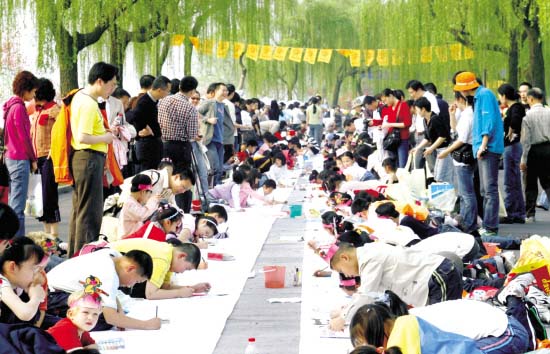 昨天正值周末,一大早,杭城市民就拖家带口准备到西湖边踏青赏花,不过一翻下断桥,所有人的注意力都被“杵”在路当中的一只卡通大金猴吸引了过去。绕过这只名为“乐乐”的动漫节吉祥物,后面的景象更让人瞠目:几百名孩子在白堤上一溜排开埋头画画,望不见头的雪白长卷两边,家长、老师、记者、游客挤了个水泄不通。所有的相机都对准画画的孩子们,两旁的依依杨柳和盛开的桃花被彻底无视。
