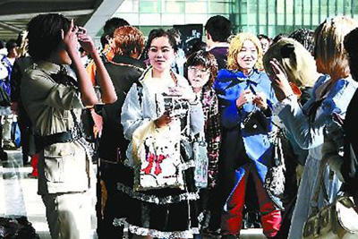 上午11时许,记者来到中关村e世界数码广场上,广场排着一条长队,从商场安保部门临时拉起的隔离带外开始,长达数百米,多达数千人,从东到西几乎将e世界商场大楼包围起来。数名保安站立在隔离带内部维持秩序,阻拦漫迷们进入。