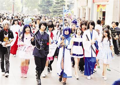 昨日,百余名来自武汉市各高校的动漫爱好者在江汉路步行街上演了一场集体真人动漫秀,吸引了众多市民好奇的目光。这些动漫爱好者们将自己化装成漫画或动画片的人物,并自己动手制作服装和道具,摆起poss还真有几分神似。