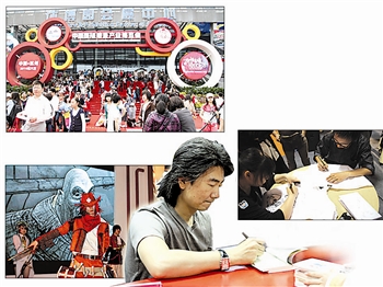 左上:休博园会展中心人山人海;左下:Cosplay舞台剧;中:朱德庸在动漫节现场签售;右:漫画家绘制T恤。