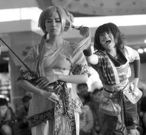 在这个刚刚过去的双休日里,杭州的气温降到了零度以下,但是解百新元华地下一层的商场里气氛火爆。2013杭州COSPLAY文化节的COSPLAY双人赛、名家签名会、动漫同人展等系列活动在这里如火如荼地进行着,唐添婷她们参加的就是本次文化节上的重头戏——COSPLAY双人组比赛,并获得了冠军。
