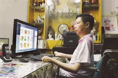 ■ 林炯在电脑前用仅能活动的一根手指绘画 李莉 摄